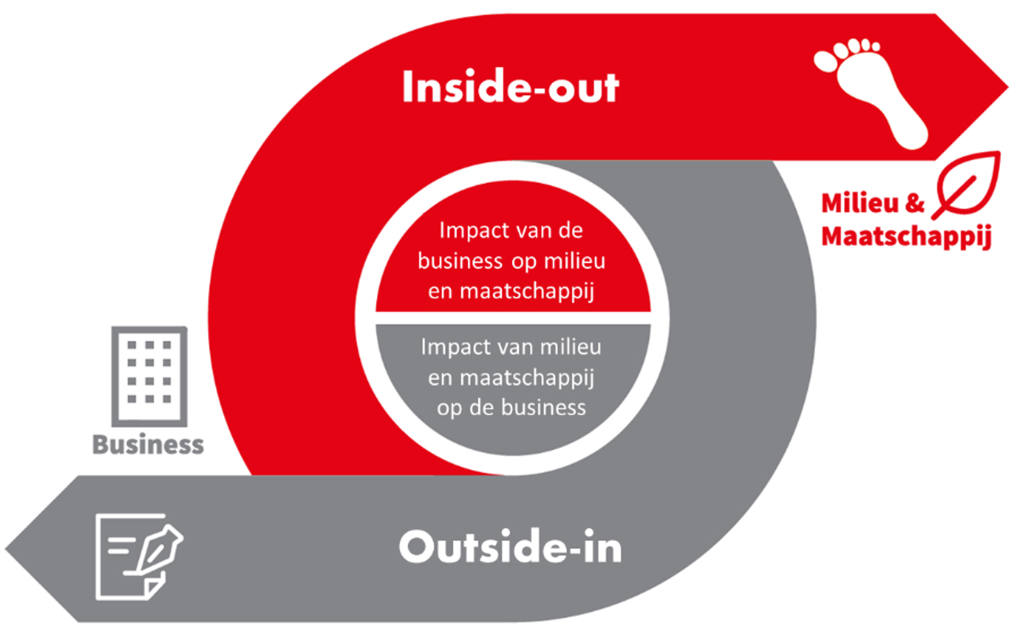 Van buiten naar binnen: Hierbij gaat het om de financiële implicaties van externe ontwikkelingen en de risico’s en kansen die deze met zich meebrengen voor de organisatie. Denk aan water- en droogteschade door klimaatverandering, netwerkcongestie en toekomstige CO2-heffingen. We spreken dan van financiële materialiteit.