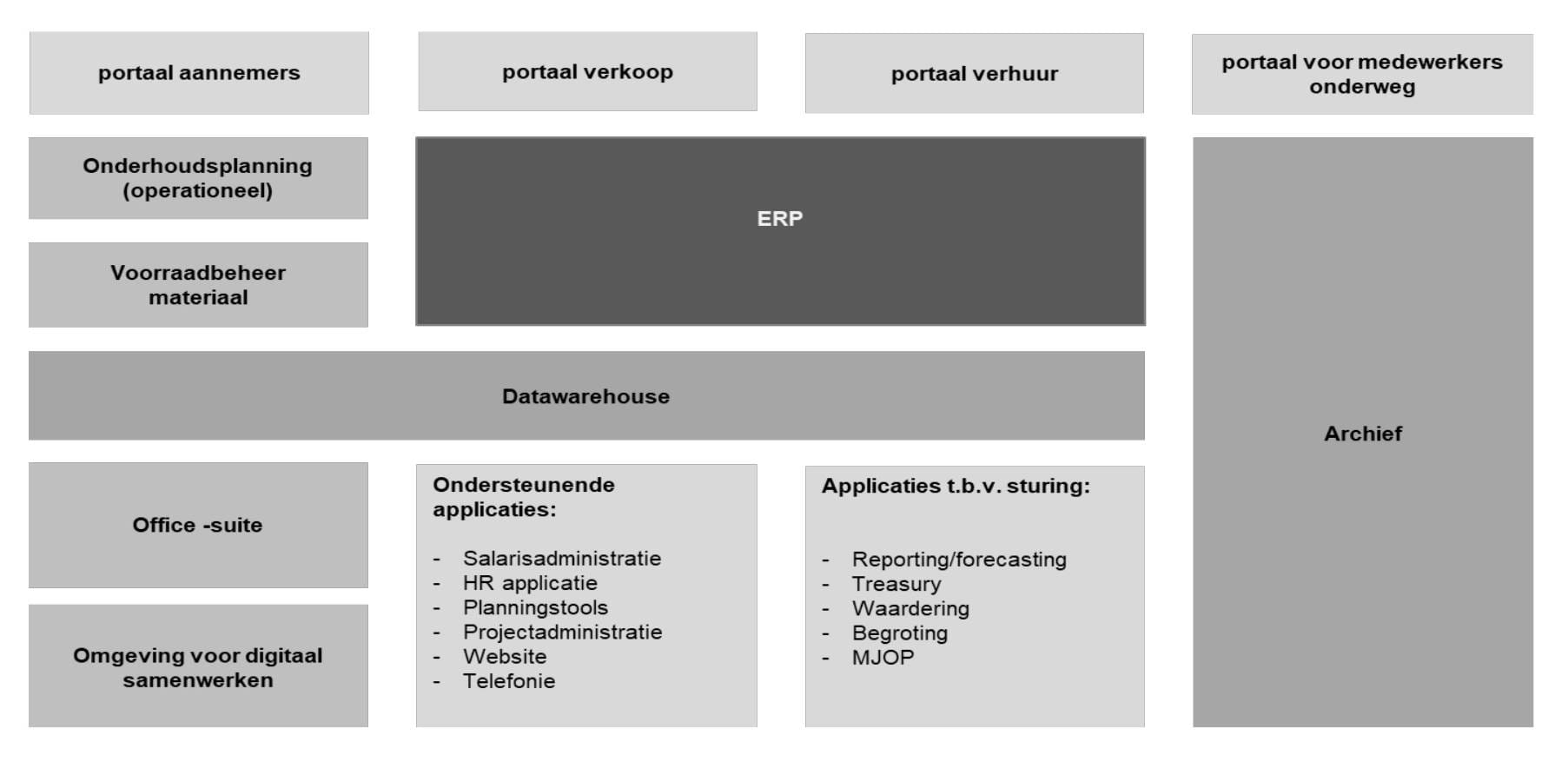 Om een voorbeeld te geven van welke (type) applicaties gebruikt worden, staat hieronder een sterk vereenvoudigd overzicht. Elk onderdeel staat voor een applicatie die één of meerdere functionele gebieden van een corporatie ondersteunt. Denk hierbij aan de keuze voor één van de sectorspecifieke ERP-pakketten.