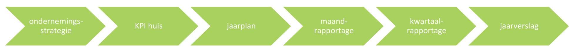 Deze worden vertaald naar tactische en operationele KPI’s, het zogenaamde ‘KPI huis’. Een goed gebouwd ‘KPI huis’ is de basis om (tussentijds) te kunnen sturen op de realisatie van de strategische doelen en de onderlinge samenhang. In de tussentijdse berichtgeving (de maand- en kwartaalrapportage) rapporteert het management/bestuur op basis van het ‘KPI huis’ over de voortgang van de realisatie van de strategische doelen.
