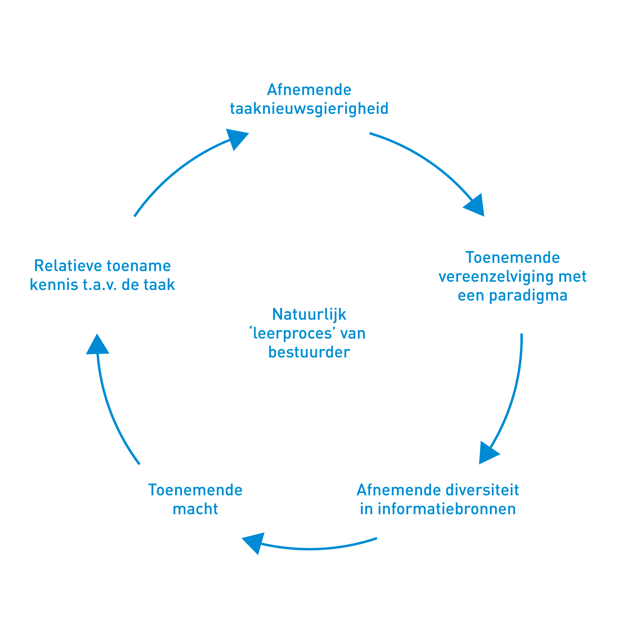 Een bestuurder met vastgeroeste ideeën die niet wordt tegengesproken, kan blijven denken dat hij gelijk heeft en zal de noodzaak om zijn denken bij te stellen niet ervaren. Zijn taaknieuwsgierigheid neemt daarmee proportioneel af. Als de kleine groep vertrouwelingen om de bestuurder heen als gevolg van selectie eenzelfde paradigma vertegenwoordigt, wordt de bestuurder daarin niet alleen bevestigd, maar kan de organisatie als geheel verkleven met dit paradigma. Het gebruik maken van andere externe bronnen is niet meer nodig, vooral niet als de sterke gedeelde visie in de organisatie aanvankelijk tot successen leidt. In een steeds veranderende omgeving kan dit fataal zijn.