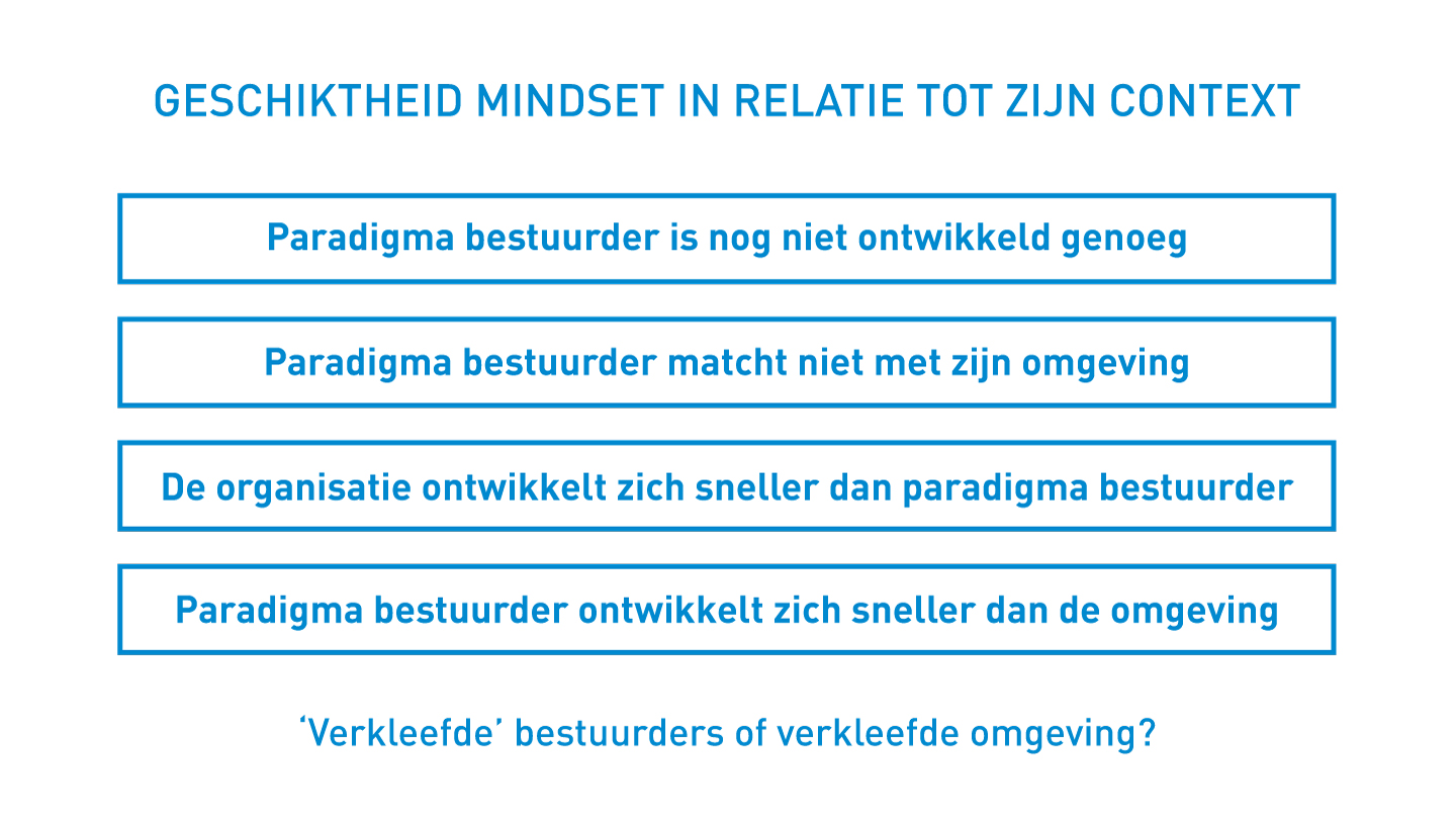 De vraag is dan ook in welke mate is de bestuurder verkleefd aan zijn paradigma en is zijn mindset dus geschikt in relatie to zijn context of is ingrijpen nodig?