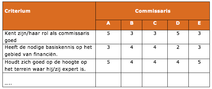 Aan de hand van een uitgewerkte lijst van criteria, vult iedere commissaris voor alle commissarissen en voor zichzelf een score in. Ook de bestuurder kan gevraagd worden om zijn/haar oordeel te geven. Onderstaande tabel illustreert dat.