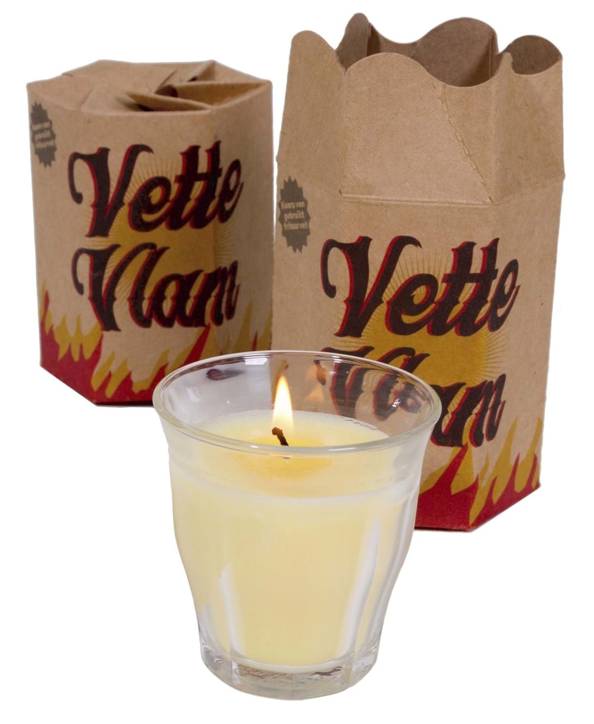 Een mooi voorbeeld van ‘up-cyclen’ is ‘De Vette Vlam’, een initiatief uit de Amsterdamse Kolenkit buurt, een gebied met veel sociale huurwoningen. Doel is om frituurolie opnieuw te gebruiken door er kaarsen van te maken. Op die manier kunnen bewoners voorkomen dat frituurvet door de WC wordt gespoeld en daar verstoppingen veroorzaakt. Dit is een veelvoorkomend en hardnekkig probleem in appartementsgebouwen van woningcorporaties. De Vette Vlam is een mooi voorbeeld om op een positieve manier waarde toe te voegen aan afval.