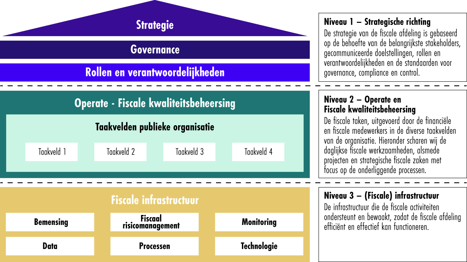 Een goed functionerend TOM bestaat uit drie basiselementen die in onderlinge samenhang moeten worden bezien. Het beter bekende Tax Control Framework, ook wel Fiscale Risico en Control Matrix genoemd, is hier een onderdeel van. Het TOM is geen control framework op zichzelf en maakt onderdeel uit van de reguliere strategie en risicobeheersing van de corporatie. Het doel is dat de reguliere processen waar uw woningcorporaties dagelijks mee te maken heeft, ook fiscaal zijn beoordeeld en in control zijn zodat (financiële) verrassingen worden voorkomen.