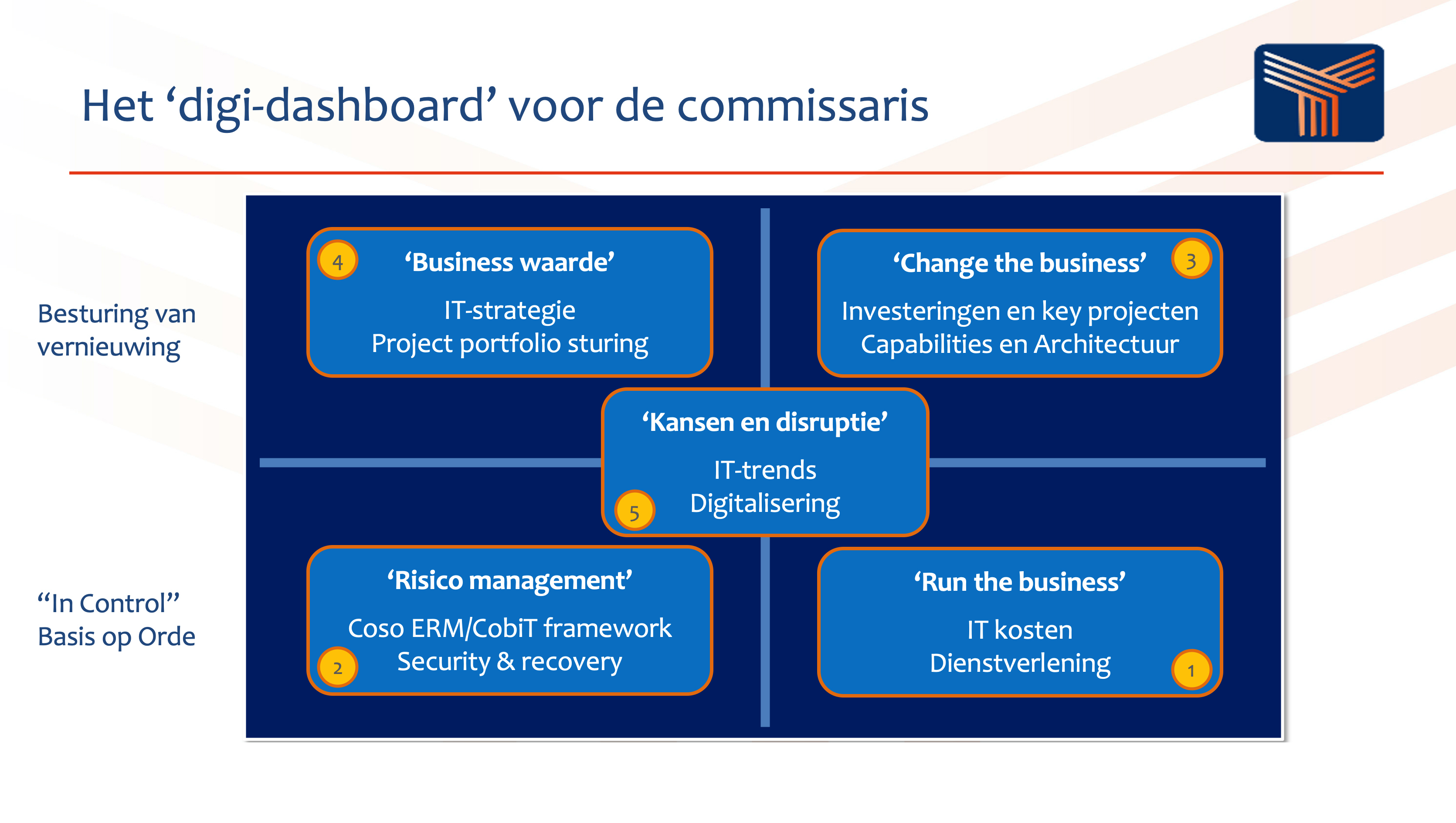 Een Digi-Dashboard is een goed instrument om het complexe thema in de bestuurskamer in vijf elementen op te splitsen: de IT-operatie, IT-risicomanagement, de digitale en IT-strategie, de projecten en – tot slot - kansen en disruptie.