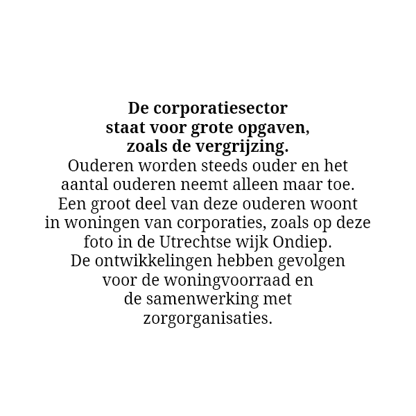 Ouderen worden steeds ouder en het aantal ouderen neemt alleen maar toe. Een groot deel van deze ouderen woont in woningen van corporaties, zoals op deze foto in de Utrechtse wijk Ondiep. De ontwikkelingen hebben gevolgen voor de woningvoorraad en de samenwerking met zorgorganisaties.