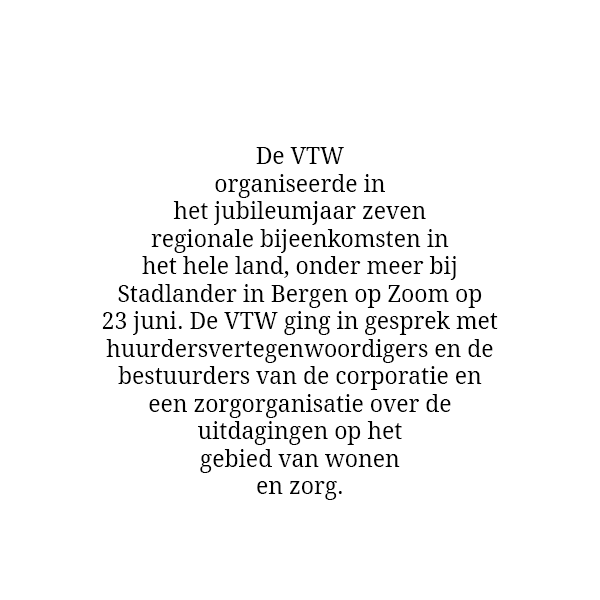 De VTW organiseerde in het jubileumjaar zeven regionale bijeenkomsten in het hele land, onder meer bij Stadlander in Bergen op Zoom op 23 juni. De VTW ging in gesprek met huurdersvertegenwoordigers en de bestuurders van de corporatie en een zorgorganisatie over de uitdagingen op het gebied van wonen en zorg.