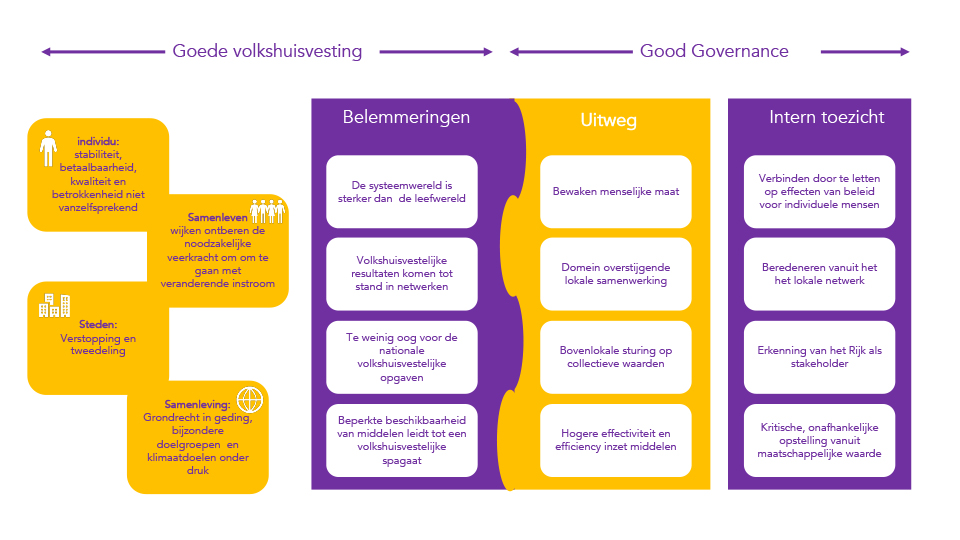 De keerzijde is dat de maatschappelijke waarde van de corporatie voor huurders, woningzoekenden en andere belanghebbende in belangrijke mate afhankelijk is van de individuele bestuurlijke afweging. Nu de opgaven groter zijn dan de beschikbare middelen, is het onvermijdelijk dat deze individuele afweging ook gaat om het prioriteren binnen de kerntaak. Gaat ze onderpresteren op de kwaliteit, de beschikbaarheid of de betaalbaarheid van het wonen? Kiezen tussen deze basisvoorwaarden is voor een woningcorporatie, als kiezen tussen kinderen voor een moeder. De governance van de volkshuisvesting moet zijn toegerust op het maken van dergelijke keuzes.