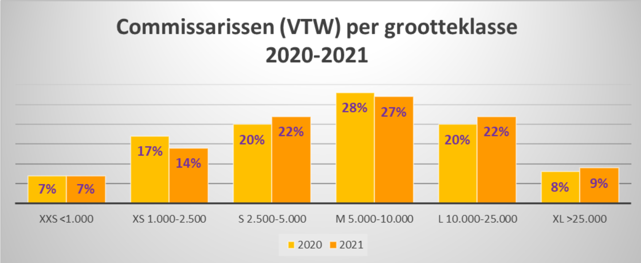 Het aantal RvC’s van XXS en XS corporaties neemt absoluut en relatief af, van grote(re) neemt het toe. Dit geldt ook voor het aantal commissarissen.