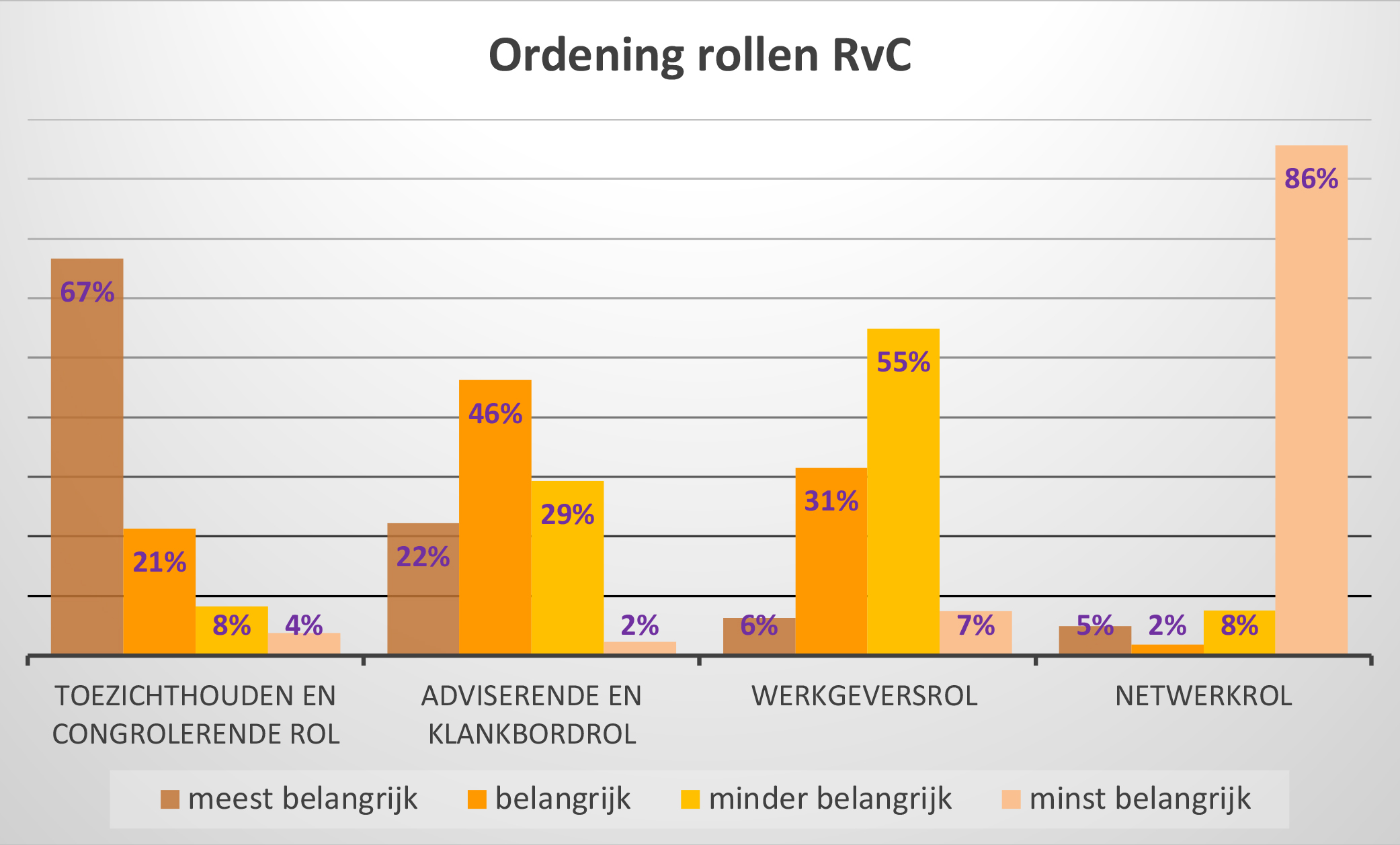 De toezichthoudende en controlerende rol wordt door commissarissen als de belangrijkste rol beschouwd.21 Onderstaande grafiek betreft de uitvraag naar het ordenen van de vier rollen; van meest belangrijk naar minst belangrijk.