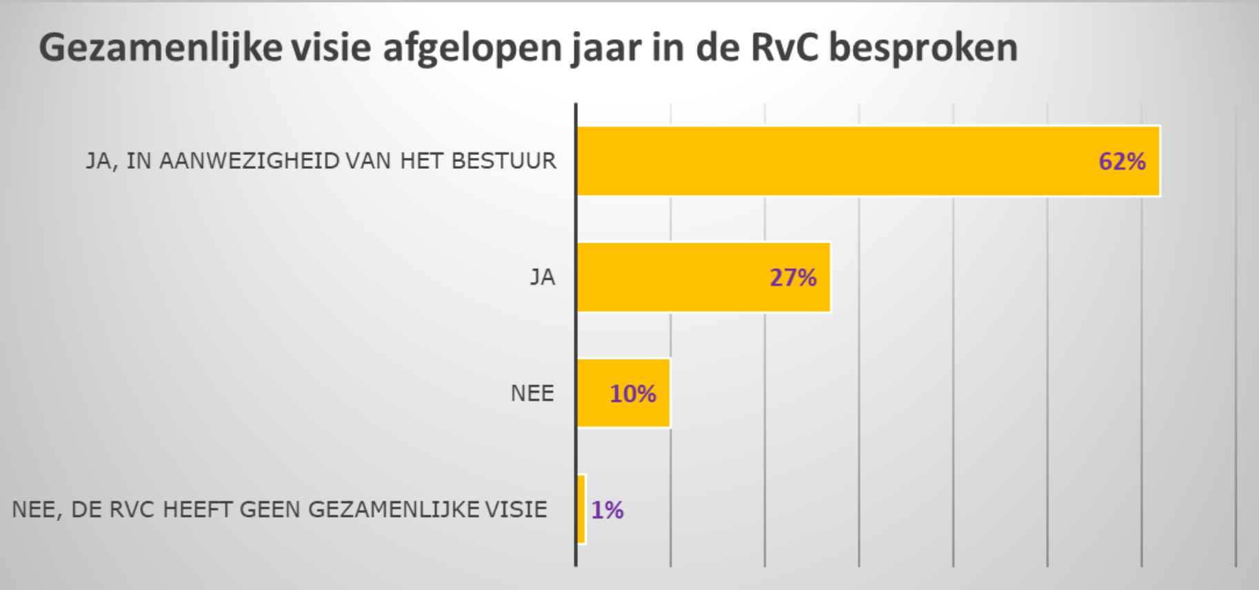Bijna 90% van de commissarissen bespreekt de gezamenlijke visie in de RvC en 62% in samenspraak met het bestuur. Ruim 10% van de commissarissen doet dit niet; 1% omdat de RvC geen visie heeft vastgesteld.22