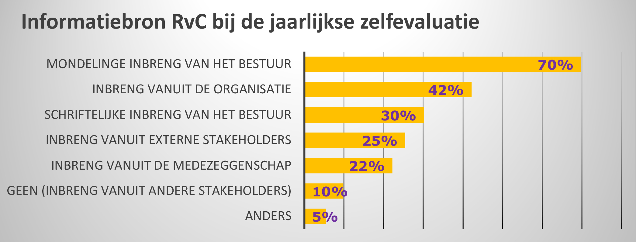 Veel commissarissen geven aan dat de RvC bij de zelfevaluatie niet alleen zijn eigen inbreng gebruikt, maar ook informatie van anderen. Bij bijna 10% is dit niet het geval.26