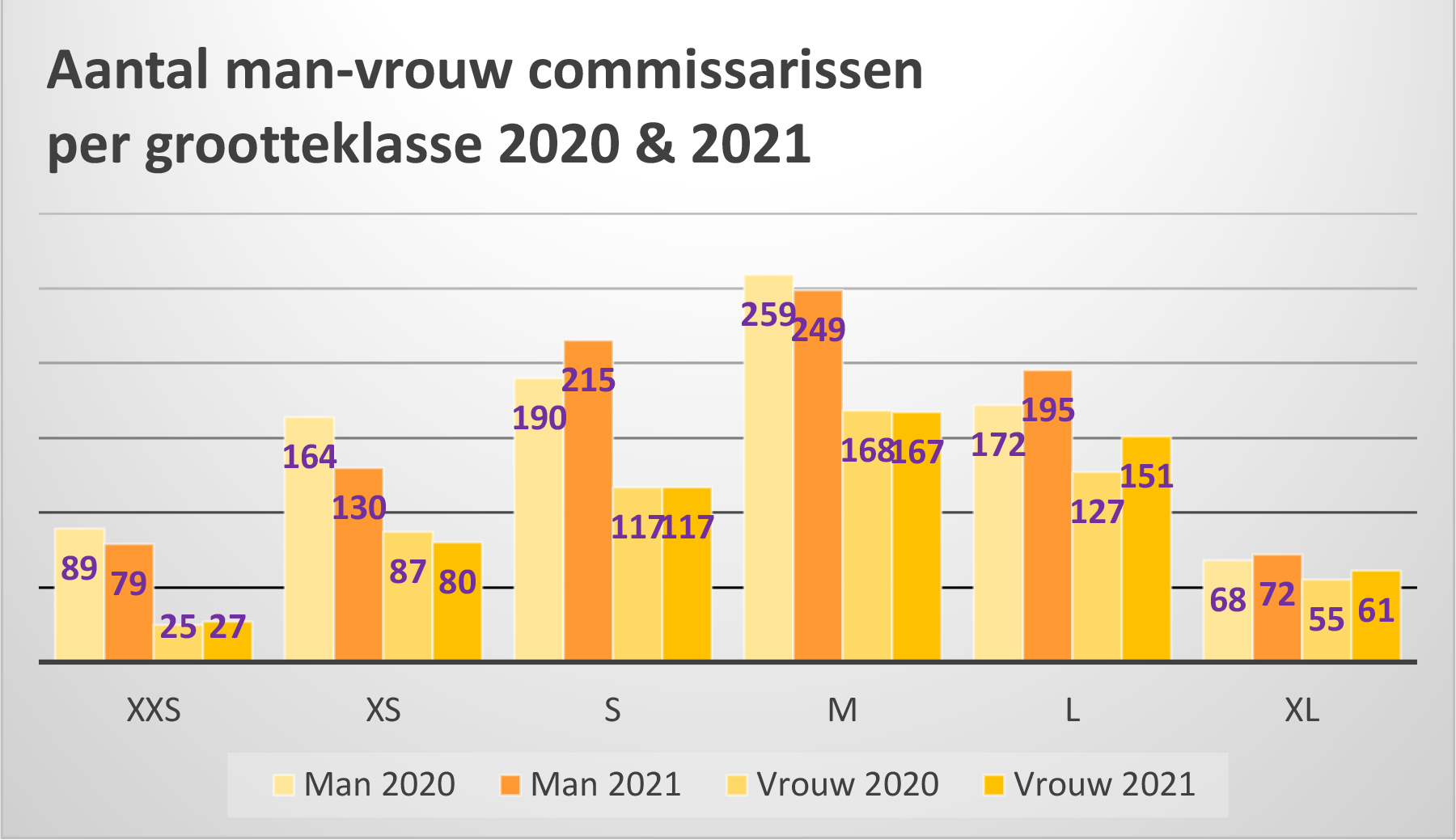 Het aandeel vrouwen in RvC’s van corporaties verdubbelde het afgelopen decennium en bedraagt in 2021 bijna 40%.3 De man-vrouwverhouding laat bij de meerderheid van de RvC’s een redelijke balans zien. In 2021 heeft bijna driekwart van de RvC’s minimaal 30% vrouwen in de raad. Maar bij ruim een kwart van de RvC’s bestaat de raad nog altijd uit meer dan 70% mannen. En 6% heeft zelfs geen enkele vrouw in de raad. Vooral in RvC’s van kleinere (XXS, XS en S) corporaties is het aandeel vrouwen relatief kleiner. Ruim 98% van de RvC’s heeft minimaal 30% mannen in de raad.