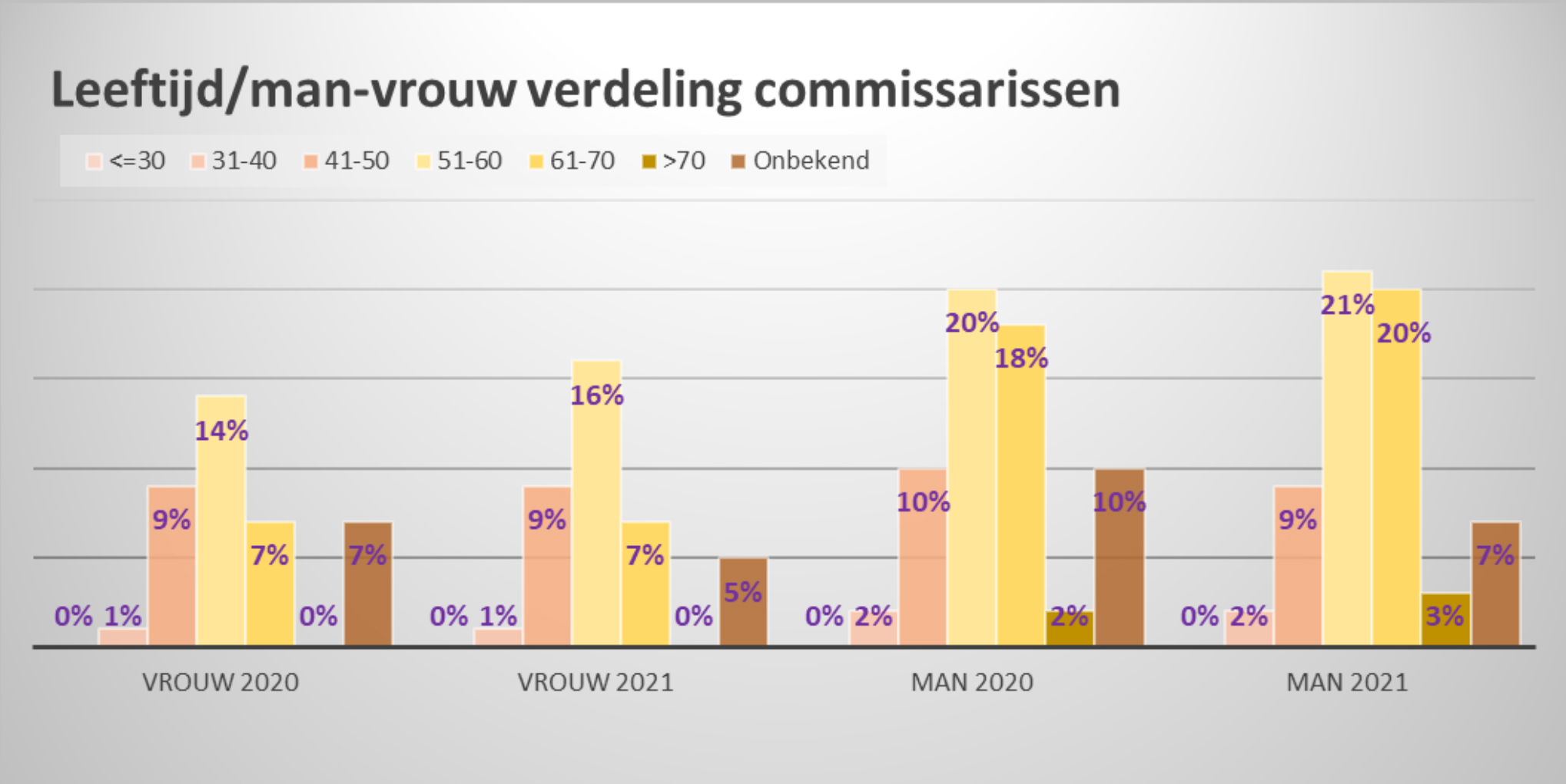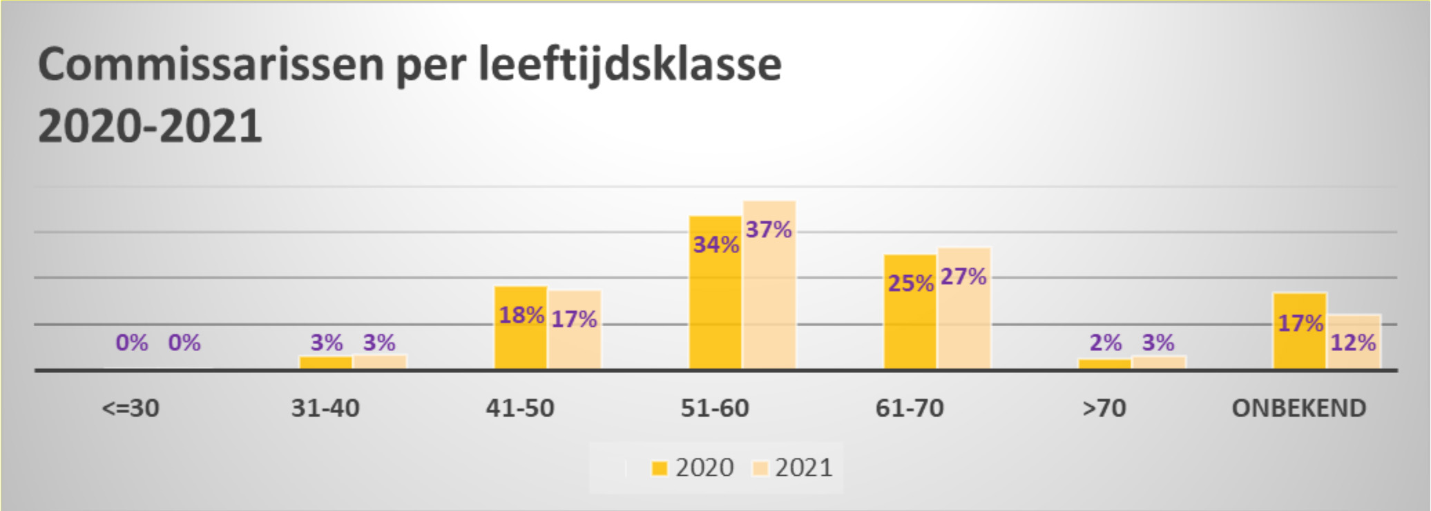 In 2021 is de gemiddelde leeftijd van de commissaris 56 jaar, net zoals in 2020. De gemiddelde leeftijd van de vrouwen ligt 4 jaar lager dan de gemiddelde leeftijd van de mannen.10