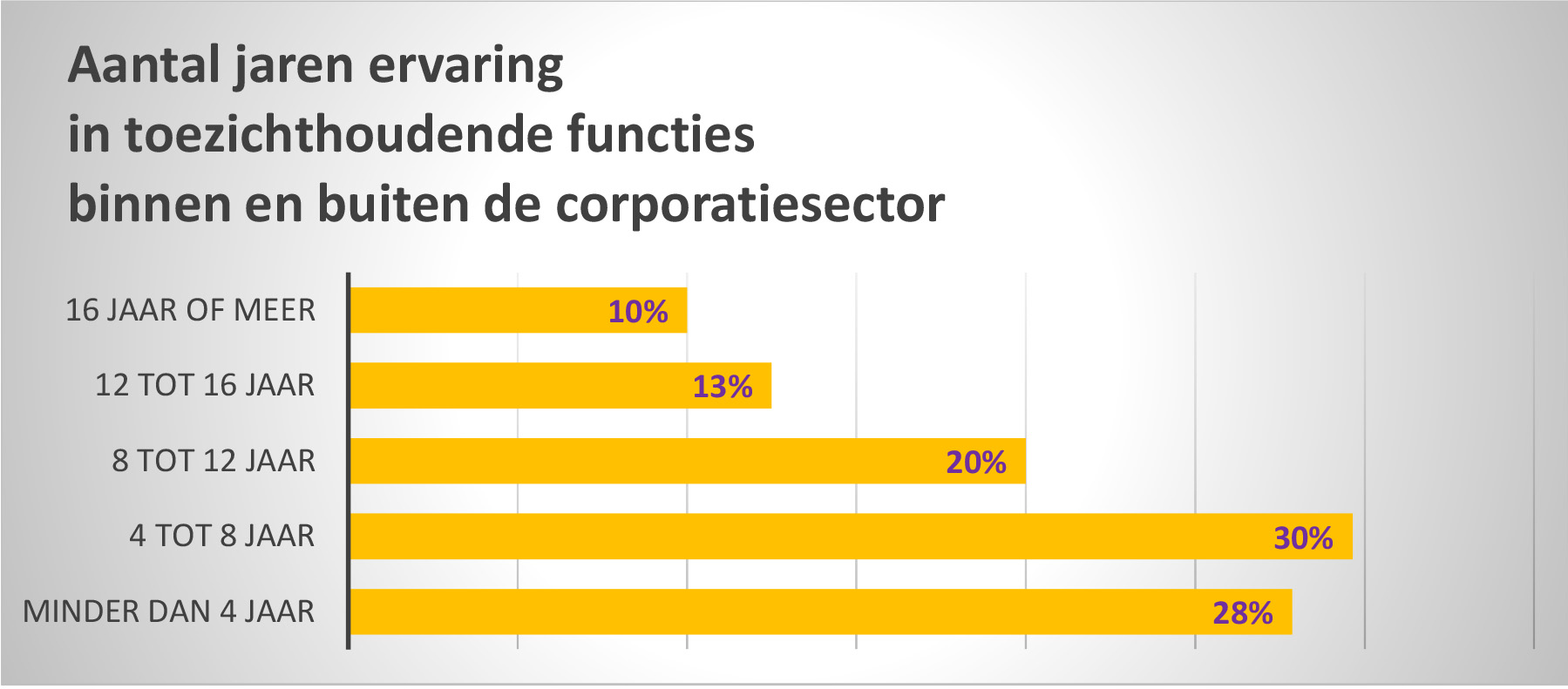 Ongeveer 50% geeft aan ook nog 1 of meer commissariaten in de zorg of bij een andere maatschappelijke onderneming te hebben. Ruim 10% heeft nog 1 of meer commissariaten bij een MKB onderneming of een groot – al dan niet beursgenoteerd – bedrijf.8